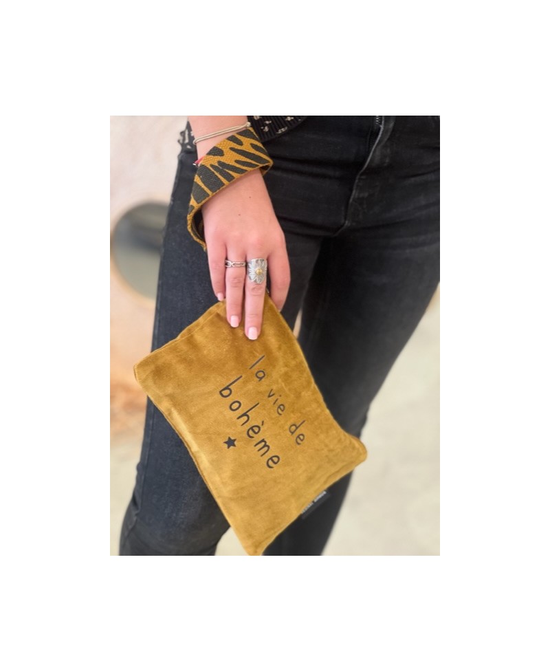 Trousse plate velours « jolis messages», sangle léopard pour un porté main